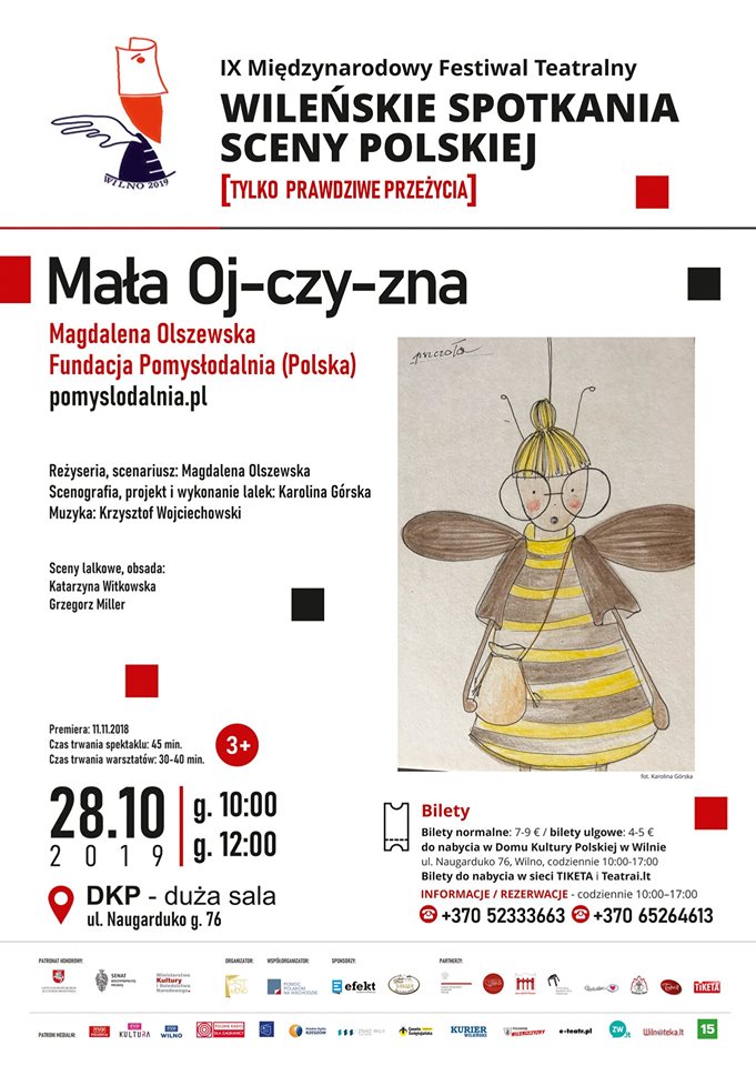 Na zaproszenie Polskiego Studia Teatralnego w Wilnie jedziemy na IX edycję Wileńskich Spotkań Teatralnych. Pokażemy dwukrotnie „Małą Oj-czy-znę” i przeprowadzimy warsztaty z polskimi dziećmi na Wileńszczyźnie.