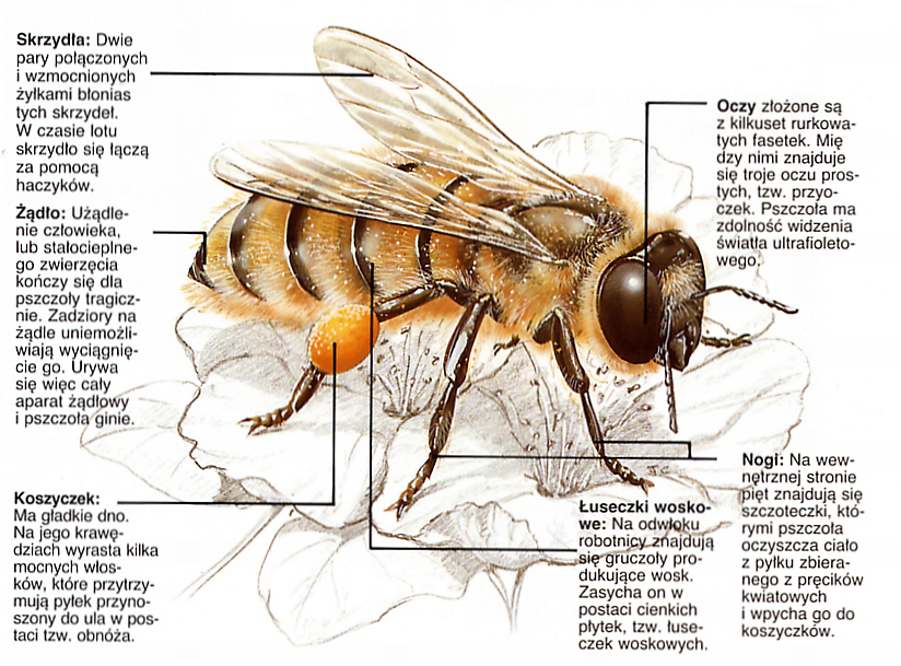 Pszczoły zaopatrzone są w „trąbkę”, czyli aparat gębowy, dwie pary skrzydeł i aparat żądłowy. Do wyprodukowania jednego kilograma miodu pszczoły potrzebują około trzech kilogramów nektaru, co oznacza około sześćdziesięciu tysięcy wylotów z ula.
