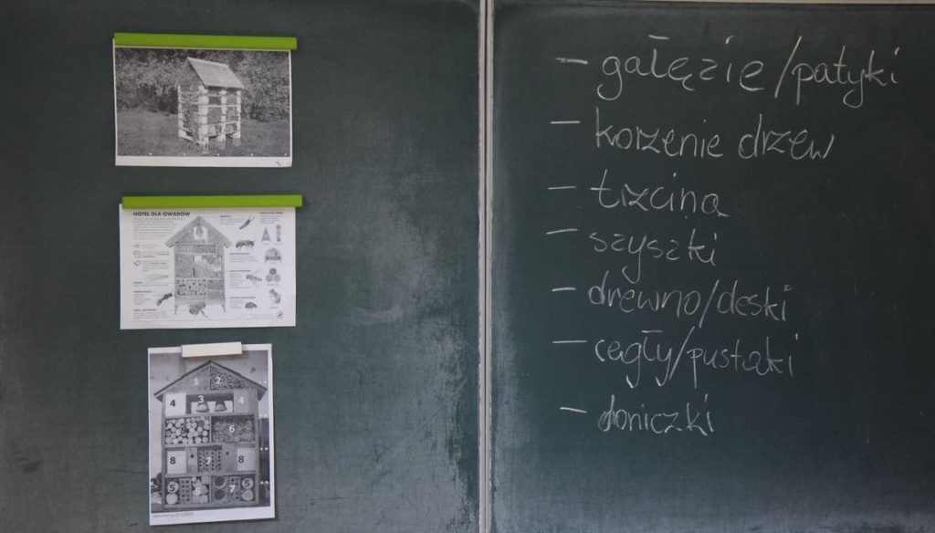 Zadanie domowe: uczniowie wspólnie z rodzicami mają odnaleźć w domu materiały potrzebne do skonstruowania hoteliku dla owadów (nie można kupować) oraz wspólnie zastanawiają się, gdzie taki hotelik można by umieścić.